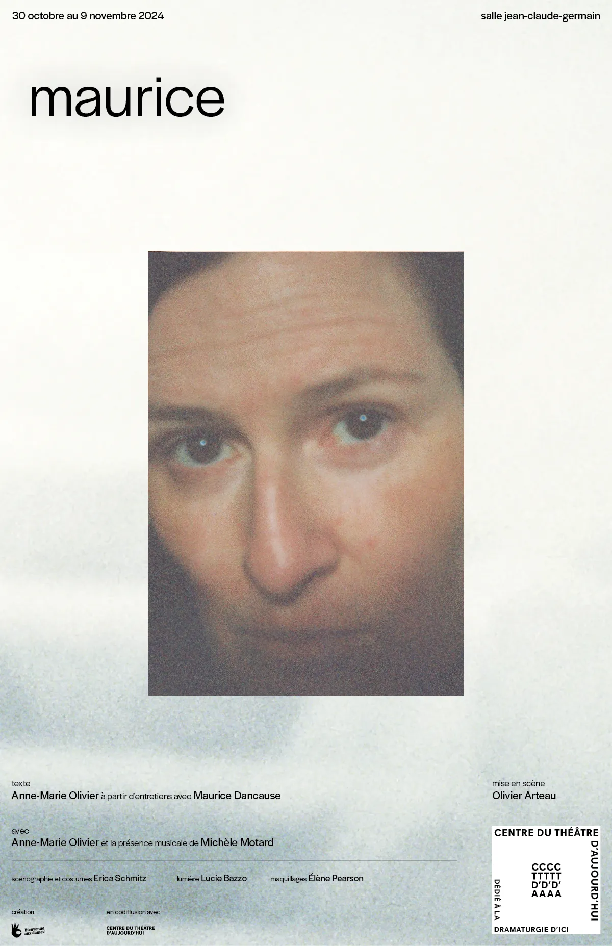 Fascinée par cette lumineuse histoire de reconstruction et de résilience, l’autrice et comédienne Anne-Marie Olivier se glisse dans la peau de cet homme à l’esprit incandescent. Elle livre à chaque représentation une performance en partie improvisée qui réinvente le langage pour mieux se l’approprier. Les mots de Maurice sont pleins, débordants. Sa soif de communiquer avec le monde est immense. Chaque soir, il aura besoin d’un spectateur ou d’une spectatrice pour aller au bout de son récit. S’inspirant d’un remarquable parcours de vie, Maurice est une expérimentation dramaturgique d’une bouleversante humanité.